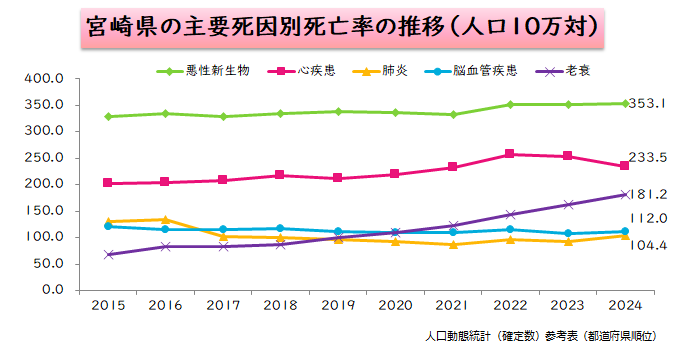 本県の死亡原因の第1位は「がん」で令和6(2024)年では、3,605人が、がんで亡くなっており、総死亡数に占めるがんによる死亡数の割合は21.9%となっています。