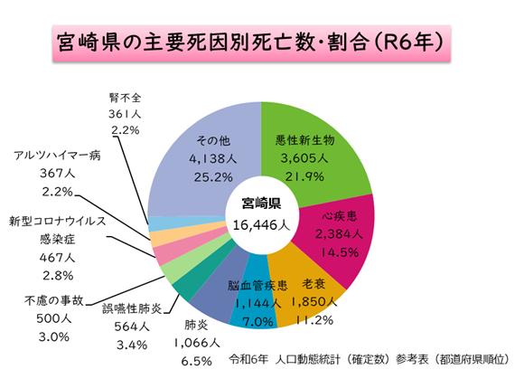 宮崎県のがん部位別死亡数は、男性は「肺」「大腸」「胃」、女性は「肺」「膵」「大腸」の順になっています。