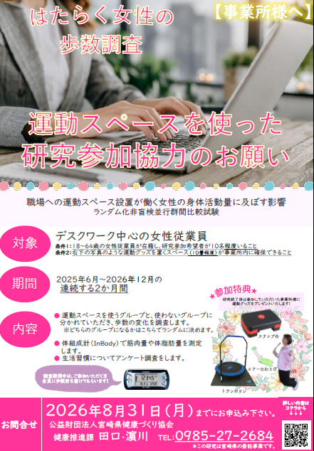 令和7年度に、下記のとおり働く女性の身体活動量に関する研究を行います。研究に参加していただける事業所を現在募集中です。